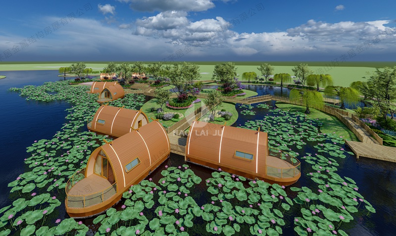 施工的過(guò)程也是最大限度的減少對(duì)環(huán)境的破壞,結(jié)構(gòu)構(gòu)件由工廠預(yù)制后再現(xiàn)場(chǎng)組裝,船屋主體由插入地下中的金屬管樁提供支撐。施工現(xiàn)場(chǎng)無(wú)濕作業(yè)無(wú)揚(yáng)塵,清潔簡(jiǎn)單高效,是保護(hù)生態(tài)環(huán)境的最佳建造方式。